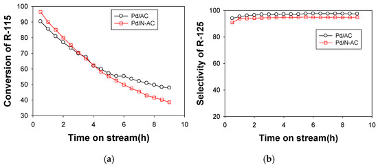 Catalytic performance of hydrodechlorination of R-115 over Pd/AC and Pd/N-AC: (a) R-115 conversion and (b) R-125 selectivity.