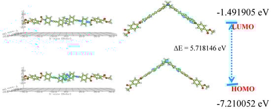 To understand the structure changes of 8. We carried out density functional theory (DFT) calculation by Gaussian 09 program using the B3LYP method with the 6-31G + (d,p) basis set. The optimized structure shown in Figure 1 and Figure 2 has a clear bent-core configuration, however the tails of the molecule are not flexible enough. The HOMO-LUMO energy gap of compound 8 is 5.718146 eV (Figure 3). Electron cloud transferred from the Tröger’s base like core to the benzene rings when the molecule excitated from HOMO to LUMO. According to the research results, this molecule has potential application in liquid crystal field and further study will be conducted.