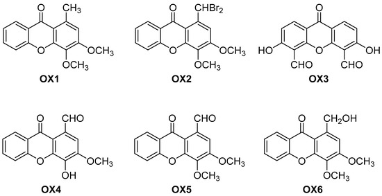 Chemical structures of the oxygenated xanthones OX 1–6 investigated in this study.