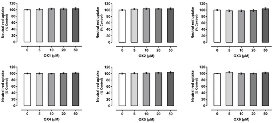 Oxygenated xanthones (OX 1–6, 0–50.0 µM) cytotoxicity in Caco-2 cells evaluated by the neutral red (NR) uptake assay, 24 h after incubation. Results are presented as mean ± SEM from four independent experiments, performed in triplicate. Statistical comparisons were made using the parametric method of one-way ANOVA, followed by the Dunnett’s multiple comparisons test.