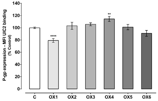 The effect of the tested xanthones on P-gp expression was evaluated by flow cytometry, using a P-gp monoclonal antibody (UIC2) conjugated with phycoerythrin (PE). As shown in Figure 3, the tested xanthone, OX4, significantly increased P-gp expression to 115%, as compared with control cells (C, 100%). On the other hand, the tested xanthone, OX1, significantly reduced P-gp expression to 79%, when compared to control cells (C, 100%). For OX2, OX3, OX5, and OX6, no significant effect on P-gp expression was observed, when compared to control cells (C, 100%). Representative histograms of the flow cytometry analysis of Caco-2 cells’ autofluorescence and UIC2-PE binding after exposure to OX4 for 24 h are illustrated in Figures S1 and S2, respectively (Supplementary Material).