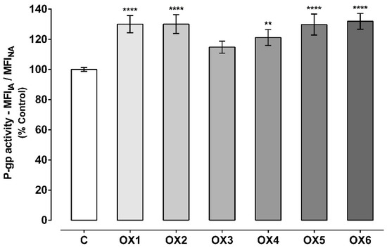 The results obtained concerning the evaluation of the OXs’ effects on P-gp expression and activity further reinforce that this approach of evaluation of both parameters has an important impact on the evaluation of the modulatory potential of new compounds. Furthermore, the data is in accordance with other reports that also suggest that alterations in P-gp expression do not linearly translate into similar changes in P-gp transport activity (which could be due to an insufficient time to guarantee complete protein function or incomplete membrane targeting) and increases in P-gp activity may occur without changes in protein expression [21,26,27,39]. In fact, Silva et al. observed in Caco-2 cells that the strong increases in P-gp expression levels after exposure to doxorubicin (Dox) (reaching 646% after 24 h of incubation with 100 μM Dox when compared to control cells (100%)) were not translated into proportional increases in P-gp transport activity (150% after a 24 h incubation period with 100 μM Dox, when compared to control cells (100%)) [21].
