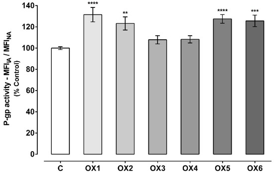 As observed in Figure 4, all the tested oxygenated xanthones except xanthone OX3, significantly and immediately (given the short incubation period) increased P-gp activity when compared to control cells (C, 100%). P-gp activity increased to 130%, 130%, 121%, 130%, and 132% when the accumulation of Rho 123 was assessed in the presence of the xanthonic derivatives, OX1, OX2, OX4, OX5, and OX6, respectively. Representative histograms of the flow cytometry analysis of Caco-2 cells’ autofluorescence and Rho 123 fluorescence after exposure to OX6 during the accumulation of the fluorescent substrate are illustrated in Figures S1 and S3, respectively (Supplementary Material).