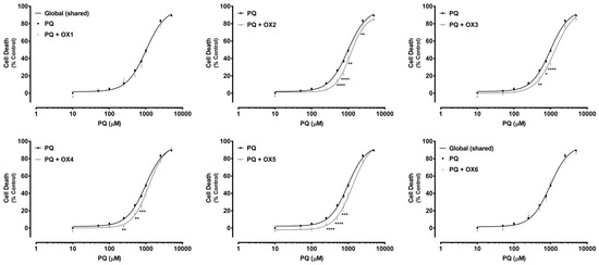 Paraquat (PQ) concentration—response (cell death) curves obtained in the absence (PQ curve) or in the presence of the six tested oxygenated xanthones (20.0 μM) (PQ + OX 1–6 curves). Results are presented as mean ± SEM from four independent experiments (performed in triplicate). Concentration—response curves were fitted using least squares as the fitting method and the comparisons between PQ and PQ + OX 1–6 curves (LOG EC50, TOP, BOTTOM, and Hill Slope) were made using the extra sum-of-squares F test. Statistical comparisons were made using two-way ANOVA, followed by the Sidak’s multiple comparisons post hoc test (* p < 0.05; ** p < 0.01; *** p < 0.001; **** p < 0.0001 PQ + OXs vs. PQ). In all cases, p values < 0.05 were considered statistically significant.