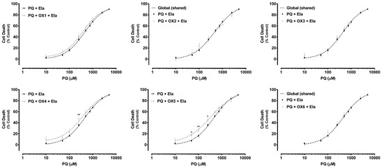 Paraquat (PQ) concentration—response (cell death) curves obtained in the presence of Elacridar (Ela, 10.0 µM) with (PQ + OXs + Ela curves) and without (PQ + Ela curve) exposure to the six tested oxygenated xanthones, OX 1–6 (20.0 µM). Results are presented as mean ± SEM from four independent experiments (performed in triplicate). Concentration—response curves were fitted using least squares as the fitting method and the comparisons between PQ + Ela and PQ + OXs + Ela curves (LOG EC50, TOP, BOTTOM, and Hill Slope) were made using the extra sum-of-squares F test. Statistical comparisons were made using two-way ANOVA, followed by the Sidak’s multiple comparisons post hoc test (* p < 0.05; ** p < 0.01 PQ + OX 1-6 + Ela vs. PQ + Ela). In all cases, p values < 0.05 were considered statistically significant.