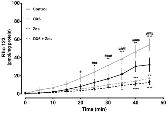 Short-term and direct effect of xanthone OX6 on P-glycoprotein (P-gp) activity, evaluated ex vivo. P-gp-mediated Rhodamine 123 (Rho 123) efflux was measured using 10 cm everted sacs from distal ileum. The sacs were filled with 300.0 μM Rho 123 (serosal side). The dye secreted into the outside compartment (mucosal side) was assessed every 5 min for 45 min, in the presence or absence of 20.0 μM OX6 and/or 10.0 μM zosuquidar (Zos). Data are expressed as means ± SEM of five to eight rats per group. The excreted amounts of Rho 123 into the mucosal side were evaluated by spectrofluorometry, using a Rho 123 calibration curve, and expressed as pmol of Rho 123 transported per mg of tissue. Statistical comparisons were made using two-way ANOVA followed by the Tukey’s multiple comparisons post hoc test (* p <0.05; ** p <0.01; *** p < 0.001; **** p < 0.0001 vs. control; # p < 0.05; ### p < 0.001; #### p < 0.0001 OX6 vs. OX6 + Zos).