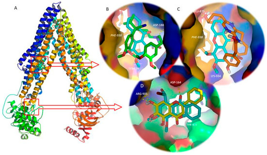 Docking studies were performed on both the TMD and NBD, using known P-gp inhibitors and activators as positive controls [36,37,38] (Table 3 and Figure 9).