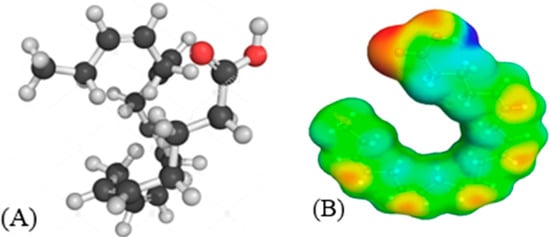 The chemical structure of EPA and its sigma surface are illustrated in Figure 1. The results of σ-profile and σ-potential are indicated in Figure 2 and Figure 3, respectively. Significant terms related to qualitative description of EPA molecules including hydrogen bonding, polarity, and lipophilicity/hydrophilicity can be visualized with the help of COSMO-RS 3D screening charge distribution (sigma surface). Charge distribution is coded in colors such as red color, which represents the negative (−ve) charge, whereas blue and green represents the positive (+ve) and neutral (0) charge on the molecular surface, respectively. The screening charge density surface (s-surface) contains all relevant information for COSMO-RS to calculate the chemical potential.