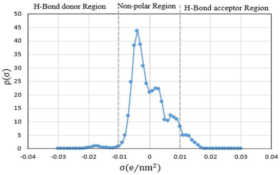 With respect to the stated assumptions, screening of charge density and capacity value at infinite dilution were performed by COSMO-RS. The significance of capacity value at infinite dilution is where it defined whether the targeted solvent has adequate strength in extraction. The screening charge density is defined as sigma profile of mixture and it can be calculated by Equations (1) and (2) [23,54,55]: