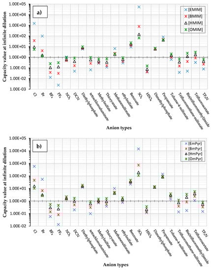 The capacity values related to five types of cation-base ILs including imidazolium, pyridinium, pyrrolidinium, piperidinium, and tetra-methyl ammonium with 22 types of anions were screened at 298.15 K and the results are summarized in Figure 4a–e. The results are followed by recommendations for the selection of suitable ILs to be applied in EPA extraction.