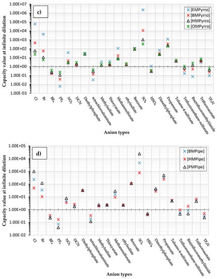 While poor capacity was observed in case of Br− with [EMPyr], higher values were recorded when paired with [EMPyrro] in the order: SO42− > Cl− > Br− > propanoate. Likewise, [CnMPIP] has a similar trend when paired with the anions: SO42−, Cl−, Br−, and propanoate, although the cyclic nature of the cation might slightly reduce the capacity.