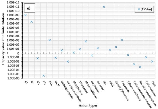 The capacity values at infinite dilution of (a) Imidazolium, (b) pyridinium, (c) Pyrrololidinium, (d) piperidinium, and (e) tetra-methyl ammonium cations alkyl chain length with 22 anion types for EPA extraction at T = 298.15 K.