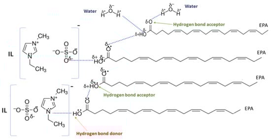 Proposed hydrogen bonding between the IL, [EMIM]+SO42−, EPA, and water available in the system during extraction.