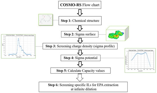 In this study, the COSMO-RS approach has been used to screen 352 ILs (22 anions-16 cations combination) and to calculate their related capacity values. Selected ILs (with higher capacity values) are intended to be applied as solvents in EPA extraction. Figure 6 illustrates the following steps for screening, and therefore, the selection of an appropriate IL to be used in the extraction of the total EPA compound.