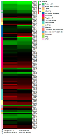 | Component Name | Class | Peak Area of 10-Day-Old Red Pods | Peak Area of 30-Day-OldRed Pods | Peak Area of 10-Day-OldGreen Pods | Peak Area of 30-Day-OldGreen Pods | Fold Change 1 (Red/Green) | VIP (Red/Green) |