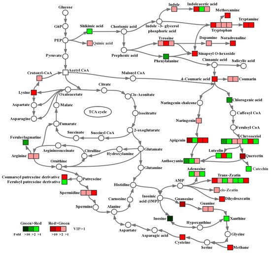 | Metabolic Pathway | Total Number of Metabolites | Detected Metabolites in Green Pods (10- and 30-Day-Old) (p Value) | Detected Metabolites in Red Pods (10- and 30-Day-Old) (p Value) | Detected Metabolites in 30-Day-OldGreen and Red Pods (p Value) |