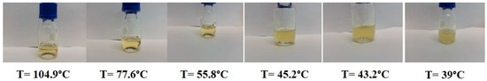 A large number of studies have focused on the phase diagrams of PVDF solutions in relation to the cloud point temperature at which a clear polymer solution becomes more viscous and cloudy [57,58,59]. Opacity can occur in a polymer solution due to the separation between lean and polymer-rich phases, and this process is known as liquid–liquid phase separation (L–L). In our PVDF/PMMA/PET systems, the solutions turned cloudy and then started to form gels at the sol-gel transition temperature, as described in Figure 1.