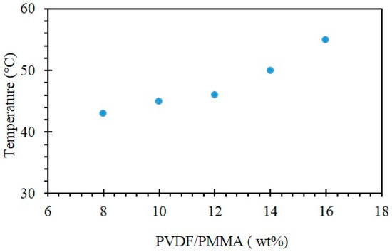 The sol-gel transition temperatures measured for TEP as a function of the concentration of PVDF/PMMA are presented in Figure 2. The obtained results show that the sol-gel transition temperature increased at higher PVDF/PMMA concentrations and it was ranging from 43 to 55 °C. This can be explained by the fact that a higher temperature is required to keep the polymer/solvent system homogeneous when the concentration of polymer is increased.