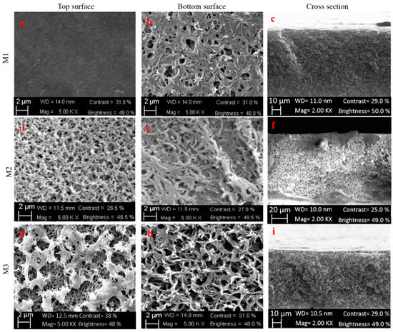 The cross-section of all the three membranes (Figure 5c,f,i) was mainly represented by a sponge-like structure even if in M5 membrane is visible the denser skin layer.