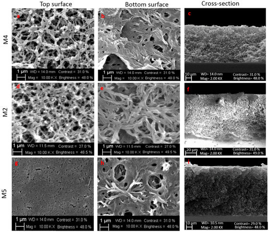 Figure 5 illustrates top surface, bottom surface and cross-sections of the investigated membranes. M2 and M4 membranes, prepared with 12 and 10 wt% of polymers concentration, respectively, presented a very porous surface for both top and bottom side (as showed in Figure 5a,b,d,e). The membrane surface of M5 prepared with 14 wt% of polymers concentration (Figure 5g), however, was quite different. Increasing the polymer concentration, in fact, a less-porous surface was observed. The reduction of cavities as a consequence of polymer concentration increase is a very well documented phenomenon [63,70]. High polymer concentrations, in fact, slow down the precipitation process of the membrane leading to the formation of a membrane with a denser top layer and lower pore size [71]. The cross-section of the membranes revealed a sponge-like structure (for higher magnification see the Supporting Material Figure S2).