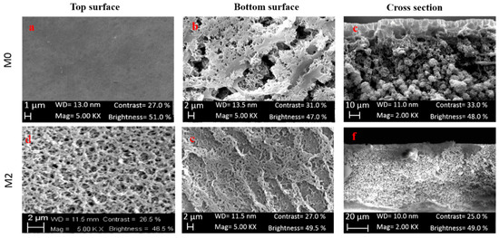 Additives with a concentration ranging from 5 to 20 wt%, are also generally responsible of membrane thickness increase as a consequence of dope solution viscosity increase and the formation of a more compact structure [73,74,75]. The addition of the additives, in fact, induced an increase in the dope solution viscosity (from 228 to 645 cP) (almost 3 times higher) and the formation of a denser kin layer (Figure 6). As can be seen in cross-section pictures (Figure 6c,f), the morphology of the membrane varied from a spherulitic structure (in case of M0) to a sponge-like structure (in case of M2). SEM magnification of membranes top layer is shown in Figure S3 of the Supporting Material.