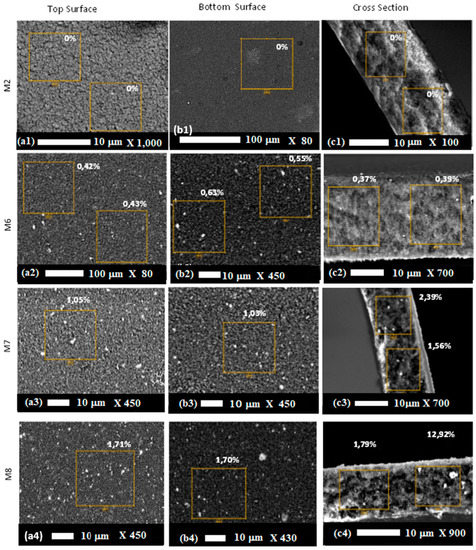 SEM-BSD (backscatter electron detector) pictures for TiO2 particles distribution on top surfaces (a), bottom surfaces (b) and cross sections (c) of M2, M6, M7, and M8 membranes.