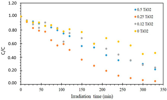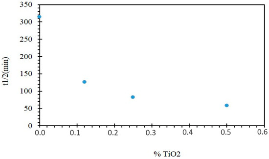 The half-reaction time increases as the reaction rate decreases. The evolution of t1/2 as a function of the TiO2 content shown in Figure 9 makes possible to deduce that the difference in photoactivity is clearly reduced for the lowest TiO2 contents.