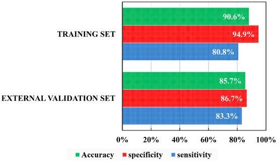Figure 1 shows the sensitivity (percentage of actives correctly classified), specificity (percentage of inactives correctly classified) and accuracy (percentage global correctly classified) for each data set. In both sets, specificity is higher than 86.5%, which reduces to the maximum the possibility of false assets, while the sensitivity is higher than 80.5%.