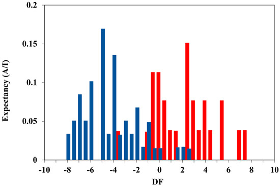 This diagram represents the expectation (probability) of finding active or inactive compounds for different DF values [17]. The red bars represent the active group (Logki < 2.60) and the blue bars represent the inactive group (Logki > 2.60). Thus, the useful DF range for classifying the compounds as active is between 0 and 8 such that a compound will be classified as active if DF falls within that range. Values of DF < 0 classify the compound as inactive, while values of DF > 8 or DF < −8 will be outside the domain of applicability of DF and will, therefore, be unclassified.