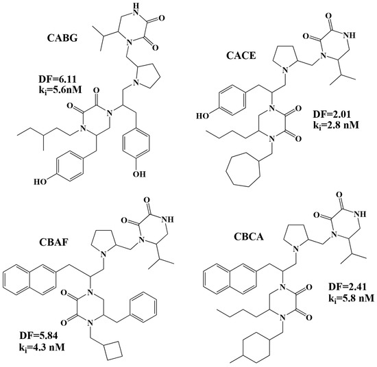 In view of the results obtained with the LDA and MLRA, a topological bonding prediction model affinity, ki, can be established, consisting of the two functions: Equation (1) and Equation (2). This way, the library generated with DesMol2 (6120 molecules) can be used to select new potential active molecules. The selection criteria were: A DF (Equation (1)) with values between 0 and 8 and Logki (Equation (2)) with values lower than 2.60, which is equivalent to concentrations lower than 400 nM. Of the 1403 molecules theoretically classified by the DF as active, 785 had a predicted Logki value < 2.60, which is equivalent to approximately the 13% of the total library molecules (see Table S5, molecules marked in yellow, green and blue). If we limit the activity further and we impose a Logki < 1.0 (ki < 10 nM), the number of highly active molecules is reduced to 87 (1.4% of the library) (see Table S5, molecules in yellow). Comparing these results with the ones by Besalú [16] using the SSIR (Superposing Significant Interaction Rules) method and the same library, it can be observed that of the 50 molecules selected by the SSIR method as the most active theoretical, 14 of them have been selected with our model with theoretical values of Logki < 1.0 (CAAA, CABG, CACE, CBAA, CBAF, CBBE, CBBG, CBCA, CBCG, CBCI, CBCL, CBCM, CBCP, CBHC) (see Table S5, molecules in yellow) and 28 with theoretical values of Log ki between 1.0 and 2.0 (CABB, CABD, CACA, CACF, CADC, CADH, CAFC, CAFH, CAHC, CAHH, CAIC, CAIH, CBAD, CBAE, CBBB, CBCD, CBCJ, CBCK, CBCN, CBCO, CBCQ, CBDC, CBDH, CBFC, CBFH, CBHH, CBIC, CBIH) (see Table S5, molecules in green). As can be seen, the most active compounds contain the isopropyl substituent in position R1; 4-hydroxybenzyl or 2-naphthylmethyl in R2; benzyl, 4-hydroxybenzyl or butyl in R3 and different substituents in position R4. All this suggests that the substituents indicated above for positions R1 and R2 are crucial for the design of new active compounds against the FPR receptor. Figure 5 shows the chemical structure of some of the potentially most active molecules.