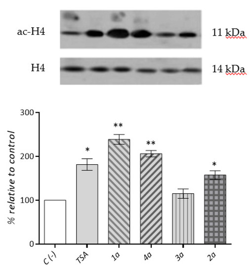 Derivatives 5a and 8a showed higher histone H4-acetylated expression levels. These results were complementary and coincident within vitro HDAC inhibition and show that the derivatives increased histone H4–acetylated expression levels, indicative of HDACs inhibition in CFs. These results are quite significant, since no cytotoxic effects were observed at working concentration.