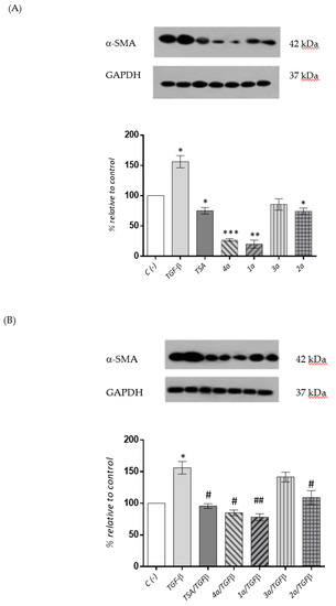 For this purpose, a fixed concentration of 5a, 6a, 7a and 8a derivatives in the presence/absence of TGF–β1 (a strong inducer of CFs–to–CMFs differentiation), was studied, and α–SMA expression levels were measured by using the western blot technique. TSA was used as a control and also for comparative purposes. In the upper panels of Figure 4 (A and B), representative photographs of α-SMA expression level and glyceraldehyde 3-phosphate dehydrogenase(GAPDH) (used as charge control) are exhibited, while in the lower panel the graphic analyses are shown. In Figure 4A, the results show significant α–SMA expression levels in CFs, and TGF–β1 significantly increased α-SMA expression levels with respect to control levels. In absence of TGF–β1, 5a, 6a and 8a derivatives decreased in a statistically significant manner α-SMA expression levels being 5a and 8a derivatives the compounds that strongly decreased α-SMA expression levels, while compound 7a had no effect. In Figure 4B it can be seen that TGF-β1 significantly increased the expression levels of α-SMA with respect to control levels. Pretreatment of CFs with 5a, 6a, 8a and TSA produce a decrease close to control levels on α-SMA expression levels induced by TGF–β1.