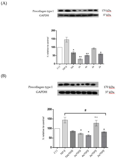 In CFs collagen type I secretion is a hallmark of cardiac fibrosis development, which is regulated by HDACs. Thus our objective was to demonstrate that in CFs the CTz derivatives reduce procollagen type I expression levels and prevent those induced by TGF–β1. For this purpose, a fixed concentration of 5a, 6a, 7a and 8a derivatives in presence/absence of TGF-β1 were studied, and procollagen type I expression levels were measured by using the western blot technique. TSA was used as control and also for comparative purposes. In Figure 5 (A and B), in the upper panel representative photographs of procollagen type I expression level and GAPDH (used as charge control) are shown, whereas in the lower panel the graphic analyses are observed. In Figure 5A, it can be seen that there is significant procollagen type I expression levels in CFs, and TGF–β1 significantly increased procollagen type I expression levels with respect to control. In absence of TGF–β1, 5a, 6a, and 8a derivatives decreased in a statistically significant manner procollagen type I expression levels with respect to control, being 5a derivative the most potent compound, while compound 7a had no effect. In Figure 5B, the results show that TGF–β1 significantly increased procollagen type I expression levels with respect to control levels. Pretreatment of CFs with 5a, 6a, and 8a derivatives and TSA decreased, close to control levels, procollagen type I expression levels induced by TGF–β1.