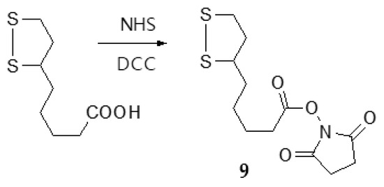 Lipoic acid (1.0 g, 5 mmol) was dissolved in dry DMF (10 mL) in a 50 mL Erlenmayer flask, the solution was cooled to 10 °C in an ice bath and NHS (0.6 g, 5 mmol) was added. The mixture was stirred for 15 min and dicyclohexylcarbodiimide (DCC, 1.0 g, 5 mmol) was added. The solution was stirred for 3 h in an ice bath and further maintained for 9 h at room temperature. The white solid dicyclohexylurea (DCU) was filtered off. The solution was cooled to 8 °C for 5 h and the remaining DCU precipitate was filtered again. The procedure was repeated until no DCU crystals were observed. The solution in DMF containing the activated lipoic (Figure 6) acid was used directly in the formation of compounds 5a–c.
