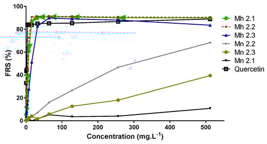 The results obtained for the antioxidant power (FRAP) show that all of the compounds isolated from M. hernandoi have high values. This finding correlates with the FRS50 results. The hydrolysable tannins tested had a high antioxidant power—especially the dimeric tannins. In the FRAP assay, the activity values for phenolic compounds seem to depend on the degree of hydroxylation and the extent of conjugation of the phenolic compounds [28]. For example, compounds 1 and 2, which are macrocyclic, and 7, which has a dimeric structure, presented the highest FRAP values (Table 1).