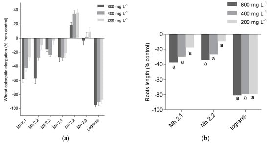 The initial extracts were tested in a general activity bioassay, namely the etiolated wheat coleoptile assay. This is an initial screening method to evaluate activity and it is highly sensitive to pharmacological activities [10] and also shows a good correlation with phytotoxic activity. The results obtained were similar to those for antioxidant activity. The extracts Mh 2.1 and Mh 2.2 exhibited a high inhibitory effect on coleoptiles, with 58% and 57% inhibition, respectively, at the highest concentrations (Figure 2a). The extracts that showed inhibitory activity on coleoptiles were evaluated for phytotoxic activity. The assay was performed using L. sativa L. (lettuce), Lycopersicum esculentum Will. (tomato), Lepidium sativum L. (cress), and Allium cepa L. (onion) as standard target species (STS) [11]. Moreover, Lolium perenne and Lolium rigidum were used as weeds and significant effects were only observed on the root growth of STS in tomato (Figure 2b). The inhibition values for extracts Mh 2.1 and Mh 2.2 on the root growth of tomato at 800 ppm were 37% and 33%, respectively. These values are lower than those obtained with Logran® (82%), a commercial herbicide used as a positive control. According to the biological activity results, the extracts Mh 2.1, Mh 2.2 and Mn 2.2 were selected for bio-guided fractionation and isolation of the major components.