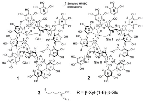 Compound 1 was obtained as a brown amorphous solid with a molecular weight of 1872.1738 and molecular formula C82H56O52, as established by the EI-MS spectrum with an ion peak at m/z 1871.1674 [M − H]− and doubly charged ion at m/z 935.0801 [M − 2H]2− in negative mode. The 1H-NMR spectrum revealed the presence of three galloyl groups by three signals that integrate to two protons each at δ 7.23, 7.09 and 6.96, which were assigned as shown in Table 2 according to long range correlations. A valoneoyl group and two hexahydroxydiphenyl (HHDP) groups were evidenced by seven 1H-singlets at δ 7.12, 6.62, 6.54, 6.48, 6.41 6.39 and 5.91, which were also assigned from the HMBC spectrum. The (S) configuration of both the HHDP and valoneoyl groups was confirmed by the circular dichroism (CD) spectrum, which exhibited a negative Cotton effect at around 253 nm and a positive effect near to 276 nm, i.e., similar to that of the lignan gomisin D, whose configuration is (S) [20], as depicted in Supplementary Materials Figure S13. The dimeric nature of 1 was demonstrated by the presence of two anomeric signals at δH 6.10 [d, J = 8.5 Hz, glucose (Glc) I, H-1] and 6.24 [d, J = 8.4 Hz, Glc II, H-1]. The other glucose proton signals were all assigned based on 1H-1H shift correlation spectroscopy (COSY) and J-resolved spectra, which indicated that the conformation adopted by the two glucoses is 4C1 and that they are fully acylated. A large difference between the chemical shifts of the H-6 proton signals on Glc II (∆H6 = 1.45) suggested the presence of a biphenyl moiety with bridged ester linkages between O-4/O-6 [21] as in telimagrandin II [22]. The location of this unit on the glucose core and its exact attachment mode were determined based on the HMBC three-bond correlations from the corresponding protons of the glucose units and from the aromatic protons to the carbonyl carbons, as summarized in Table 3 and Figure 3. The signal at δ 7.12 (valoneoyl E-6) showed connectivity to the glucose I H-4 (5.92) at three bonds with an ester carbonyl at 165.7 ppm. Similarly, the signal at δ 5.91 (valoneoyl C’-3) showed coupling to the glucose II H-2 (5.09) and to an ester carbonyl at 169.5 ppm and the signal at δ 6.48 (valoneoyl D-3) correlated to the glucose I H-3 (5.54) and with an ester carbonyl at δ 170.5. These spectroscopic data for 1 were different to those of the isomer nobotanin B [23], especially for the valoneoyl signal at 5.91 ppm in 1, which is shifted downfield with respect to the signal at 6.12 ppm in nobotanin B, and also the sugar signals H-3, H-4 and H-6. The evidence outlined above is consistent with compound 1 being a dimer of pentagalloyl glucose [24] and tellimagrandin II; which, in a biogenetic approach, is initially linked by oxidative C–C coupling between the galloyl units on C-2 of the pentagalloyl glucose and that on C-3 of the tellimagandin II to give intermediate I (Figure 3). In the next step, the macrocycle is generated by another oxidative coupling between the galloyl units from C-2 of telimagrandin II to C-3 of pentagalloyl glucose to generate intermediate II. An oxidative C–O–C coupling between rings D and E of positions 3 and 4 of pentagalloyl glucose leads to the formation of merianin A (1); while the oxidative C–O–C coupling between the 1 and 2 of telimagrandin II produces the merianin B isomer (2). The letters of the aromatic rings were assigned according to the sequence of galloylation in the biosynthesis of the pentagalloyl glucose. This biogenetic proposal is reinforced by the downfield shift of carbons C-2 and C-3 in both glucose units, with respect to pentagalloyl glucose and tellimagrandin II, as shown in Table 3. Acid hydrolysis followed by methylation and silylation of 1 confirmed the identity of the sugars in the molecule as d-glucose. The structure of compound 1 was therefore established as the macrobicyclic hydrolysable tannin merianin A (1), as shown in Figure 4.