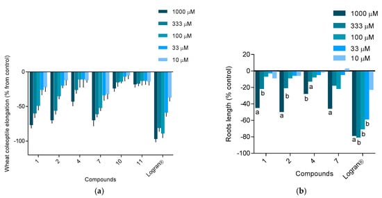 All extracts were tested in this general activity bioassay and this initial screening was employed to evaluate activity. Wheat seeds (Triticum aestivum L.) were used in this bioassay according to the methodology previously described in the literature [35]. The extracts were prepared at 800, 400 and 200 mg L−1 and the pure compounds at 1000, 333, 100, 33 and 10 µM. A buffered nutritive aqueous solution with DMSO (0.5% v/v) without any tested extract was used as negative control. The commercial herbicide Logran® was used as positive control. Coleoptile elongation was measured using the Photomed© system. The results are presented in bar charts and are shown as percentage differences from the control. Thus, zero represents the control, negative values represent inhibition and positive values denote stimulation of the evaluated parameter.
