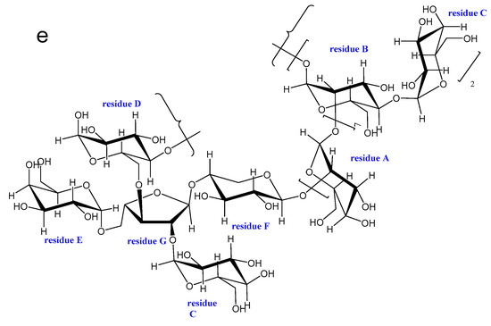 | E | α-d-Galp-(1→ | 102.1 5.06 | 70.2 3.82 | 73.2 4.13 | 71.2 4.02 | 73.3 4.04 | 61.1 3.72 |