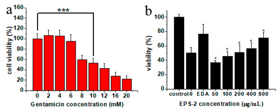 2.5. Effects of EPS-2 on the Viability of House Ear Institute-Organ of Corti 1 (HEI-OC1) Cells Treated with GM