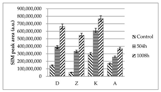 The 1,6-Hexanediamine ions (m/z = 30) were selected for quantitative analysis as they had the highest strength in the captured mass spectrum, and showed the highest selectivity. The analysis results of the 1,6-Hexanediamine ions using the GC/MS-selected ion monitoring (SIM) mode are shown in Figure 5. As immersion time increased (0 to 1,008 h), more 1,6-Hexanediamine ions were detected from D, Z, K, and A. This provides proof that hydroxyl groups of moisture (MEG) react with PA66 chains via hydrolysis, which in turn decomposed to 1,6-Hexanediamine.
