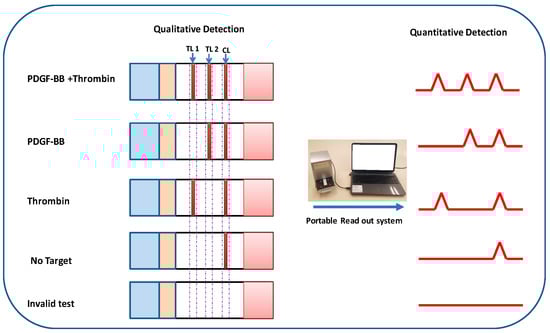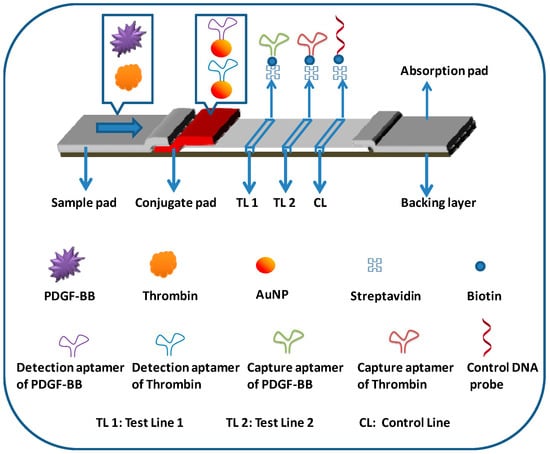 Schematic representation of lateral flow aptasensor for the simultaneous detection of PDGF-BB and thrombin.
