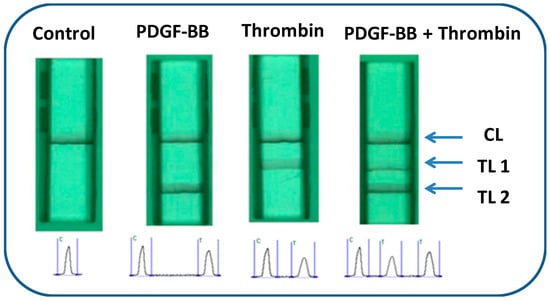 Typical photo images of lateral flow aptasensors (LFAs) and recorded responses of the LFAs in the presence of 0 nM thrombin + 0 nM PDGF-BB (control); 50 nM PDGF-BB; 50 nM thrombin; and 50 nM thrombin + 50 nM PDGF-BB. The optical intensities of the test and the control lines were recorded simultaneously using ‘Gold-Bio strip reader’ software, which could search the red bands in a fixed reaction area automatically and then determine parameters such as peak area integral. TL1: test line 1; TL2: test line 2; CL: control line. Please confirm if it’s necessary to explain C and T in the below of this figure.