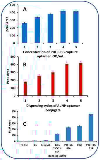 The analytical parameters, including the concentrations of capture aptamers on the test zones, the dispensing cycles of the AuNP-aptamer conjugates, and the components of the running buffers, were optimized using PDGF-BB and its aptamers as a model. The intensity of the LFA test zone was affected by the concentration of the capture aptamer (Figure 3A). One can see that the intensity of the LFA test zone increased with the increase of capture aptamer concentration from 1 OD/mL to 4 OD/mL; a further concentration increase resulted in signal saturation. As a result, 4 OD/mL of captured aptamer was used to prepare the test zone. The volume of AuNP-aptamer conjugates loaded on the conjugate pad affected the intensities of both test and control zones greatly. To obtain a maximum response using a minimal amount of AuNP-aptamer conjugates, the amount of AuNP-aptamer conjugates on the conjugate pad was optimized by increasing the dispensing cycles of the conjugate solutions. Figure 3B displays the histogram for the peak area of test line with an increasing cycle. It can be seen that the peak area from the test line of LFA increased up to four cycles. Therefore, a four-cycle procedure was employed as the optimal dispensing cycle in the following experiments.