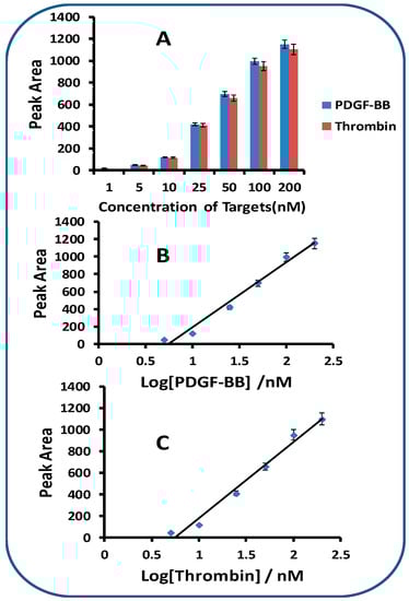 The detection and the quantification of proteins play pivotal roles in basic discovery research and clinical applications []. Thrombin is an extracellular serine protease that plays a crucial role in the blood coagulation cascade, thrombosis, and hemostasis [,]. Its concentration in blood varies from nanomolar to low micromolar levels. The concentration of thrombin is connected to various coagulation abnormalities []. Platelet-derived growth factor (PDGF) is an important growth factor protein in human platelets that regulates cell growth and division toward fibroblasts, smooth muscle cells, and glial cells []. PDGF has been implicated in the pathogenesis of angiogenesis, and it is widely used as a biomarker for tumor types of hepatic fibrosis, liver cancer, and gastrointestinal stromal tumors []. Thus, the precise and sensitive evaluation of these proteins in biological samples will be substantial for disease diagnosis and biomedical applications. The gold standard method for the detection of PDGF and thrombin is enzyme-linked immunosorbent assay (ELISA), which involves antibodies and an enzyme label [,]. However, the utilization of antibodies may encounter some drawbacks with their production, stability, and modification.