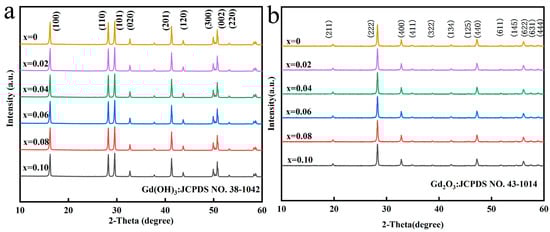 (a) is XRD spectra of precursors doped with different Eu contents, (b) is XRD spectra of (Gd0.93−xTb0.07Eux)2O3 (x = 0–0.10) precursors calcined at 1100 °C.