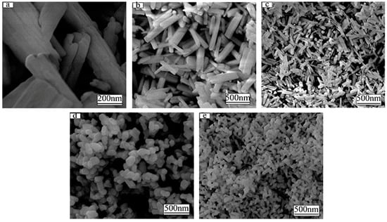 The FE-SEM morphologies of (Gd0.89Tb0.07Eu0.04)2O3 precursor synthesized with pH = 8 (a), 9 (b), 10 (c), 11 (d), 12 (e), respectively (hydrothermal temperature: 140 °C).