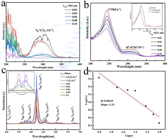 where I represents the Eu3+ emission intensity, c is the Eu3+ concentration, d = 3 for a regular sample, f is a constant, and s is the electric multipole index. When values of 3, 6, 8 and 10 are assigned to s, different exchange interaction, dipole-dipole, dipole-quadrupole, and quadrupole-quadrupole electric interactions are obtained, respectively. The log(I/c)-log(c) plot that corresponds to emission at 611 nm is shown in Figure 4d. The fitted slope (−s/3) was calculated to be −1.13, thus s = 3.42 (~3) for the (Gd0.93−xTb0.07Eux)2O3 systems, indicating that concentration quenching is mostly caused by the energy transfer between Eu3+ ions [26,29].
