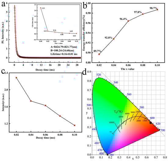 where I refers to luminescence intensity, t represents the decay time τR denotes the lifetime and A and B are the constants [32]. The fitted result yields A = 8424.79 ± 821.77 (au), B = 100.24 ± 24.60 (au) and τR = 0.16 ± 0.01 ms. The lifetime values for Tb3+ shown in the inset of Figure 6a decrease gradually with increasing Eu3+ content because of energy transfer Tb3+→Eu3+. with transfer efficiency (ηET) being obtained by evaluating the lifetime of Tb3+ with (τS) and without (τS0) Eu3+ doping through Equation (3) [33]: