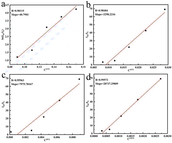 The relationship lnIs0/Is-C (a) and IS0/IS-Cn/3 of (Gd0.89Tb0.07Eu0.04)2O3 (reaction pH = 9.0, hydrothermal temperature: 140 °C, calcination temperature: 1100 °C) with n = 6 (b), n = 8 (c), n = 10 (d), respectively.